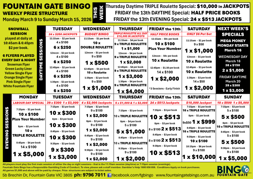 Fountain Gate Bingo. 5b Brechin Drive, Fountain Gate, 3805. Tel: 9796 7011